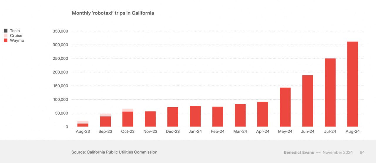 На графике — количество поездок на беспилотных такси в Калифорнии по месяцам. С мая 2024 года рост ускорился, и основной вклад в него вносит Waymo — дочерняя компания Google.