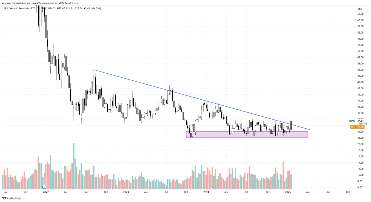 3️⃣ Камбэк Кэти Вуд? ETF $ARKK демонстрирует признаки разворота, а индекс компаний малой капитализации $IWM на рекордных значениях c конца 2021 года. Ожидания снижения ставки и поддержки малого бизнеса стимулируют рост.