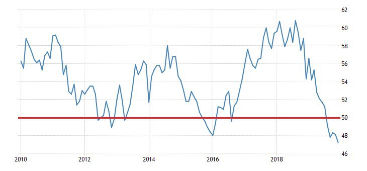 Почему это важно? Буквально на днях вышли данные за декабрь, и они оказались хуже ожиданий. Индекс упал до 47,2 в декабре, самого низкого уровня с июня 2009 года. Значение ниже 50 указывает на сокращение производственного сектора по сравнению с прошлым месяцем. На графике видно, что этот показатель снижается уже несколько месяцев подряд, что действительно настораживает.