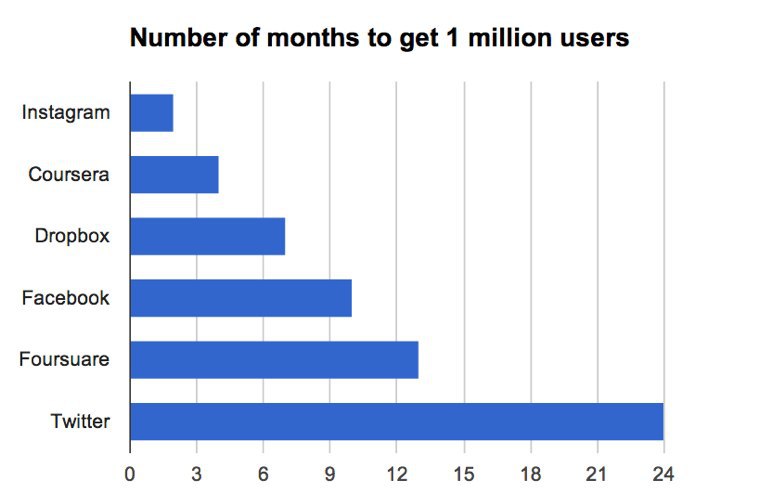 На графике - сколько месяцев потребовалось компаниям, чтобы привлечь 1 млн пользователей. Показатели Coursera выглядят впечатляюще.