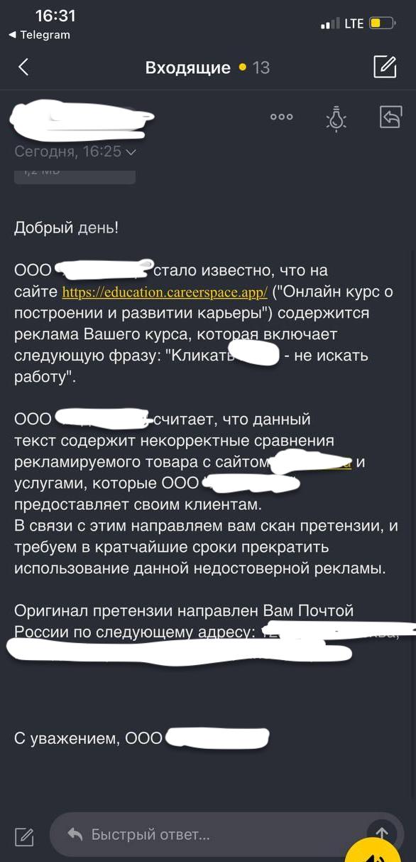 Но вы прикиньте, насколько клёвый наш карьерный курс, если нам шлют претензии на него такие ребята? Это ж просто аааааа. А мне казалось, что мы маленькие)