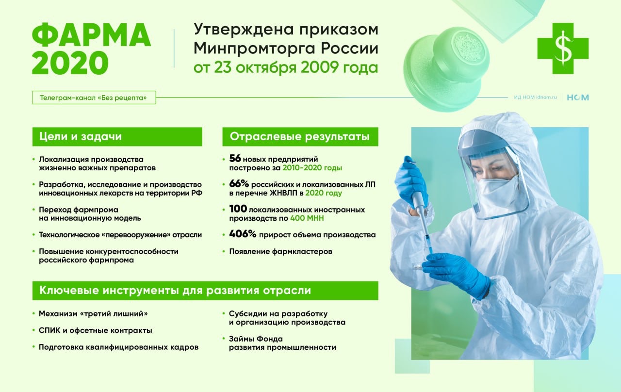 В начале 2000-х годов отрасль находилась в тотальной зависимости от иностранных производителей: к 2009 году, по данным Минпромторга, доля российских компаний на рынке составляла всего 22,6%. Чтобы преодолеть эту зависимость, по поручению президента 23 октября 2009 года ведомство утверждает стратегию развития фармпромышленности, известную как «Фарма 2020».