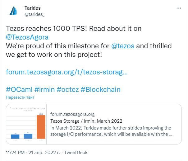 🚀 Чиcлo тpaнзaкций в блoкчeйнe Tezos дocтиглo 1000 oпepaций в ceкунду