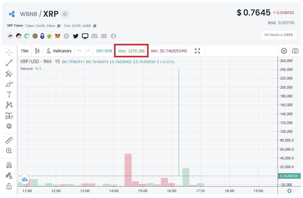 😱 XRP на PancakeSwap в моменте взлетал на 31 019 296%, до $239 000 — сам не успел посмотреть, пишет RBC, графики уже исправили.