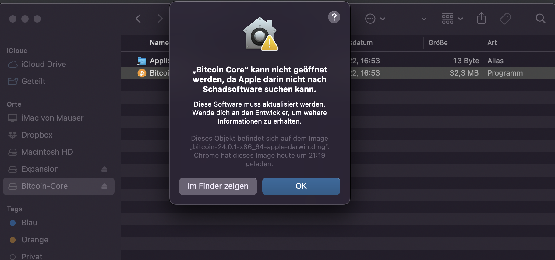 THX for your answer. I could load that key and somehow I guess he signed my downloaded Bitcoin Core program. But I am not able to start the program with the name "bitcoin-24.0.1-x86_64-apple-darwin.dmg". Must be a basic error of me as I am not a dev and using a terminal is already a big achievement for me, lol <img width="908" alt="Bildschirmfoto 2023-02-14 um 22 01 41" src="https://user-images.githubusercontent.com/125405780/218862325-81145c83-21f9-4d67-a712-1a18ce5f3537.png">