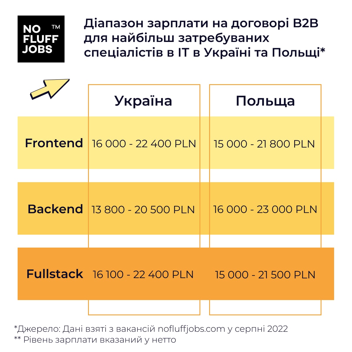 Медіана у випадку роботи за B2B-контрактом (аналог українського ФОПа) — від 16 000 до 22 400 злотих нетто в Україні (128 тис грн - 179 тис грн) та від 15 000 до 21 800 злотих нетто + ПДВ у Польщі (120 тис грн - 174 тис грн). Щоб перерахувати в гривні - потрібно помножити на 8.