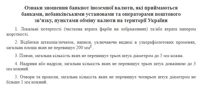 На скріншоті перелік ознак зношеності купюр, які банки та пункти обміну зобов'язані приймати (із постанови НБУ). Зберігайте і показуйте працівникам пунктів обміну.