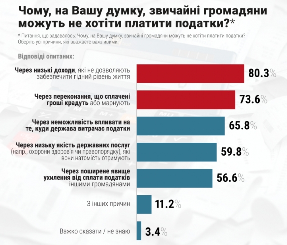 80,3% опитаних на запитання “Чому, на вашу думку, громадяни можуть не хотіти платити податки?” обрали варіант “Через низькі доходи, які не дозволяють забезпечити гідний рівень життя”.