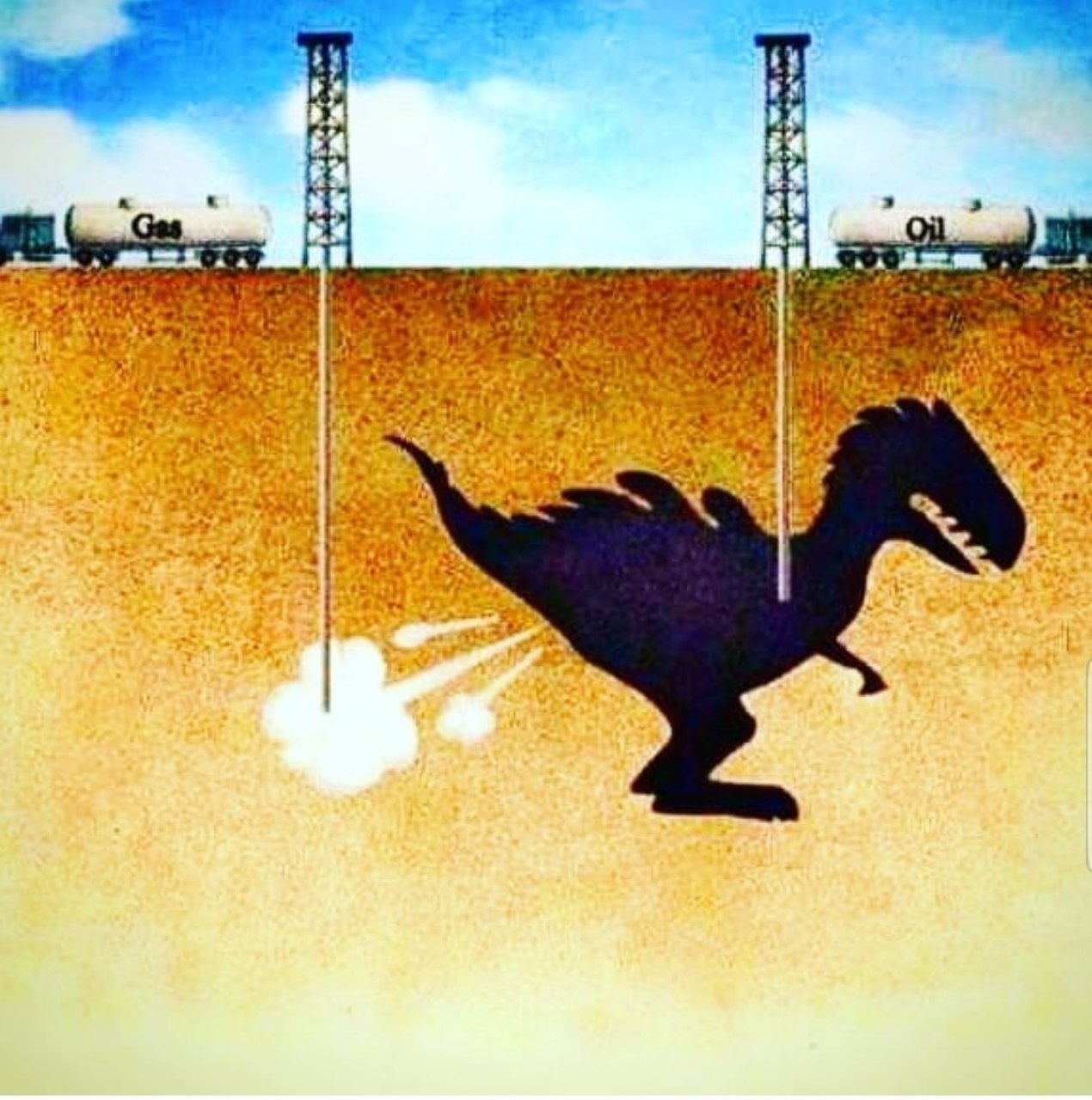 Картинка в иллюстрации смешная, но неправильная. То, что сейчас нефть и газ, умерло, по доминирующей гипотезе, до динозавров.