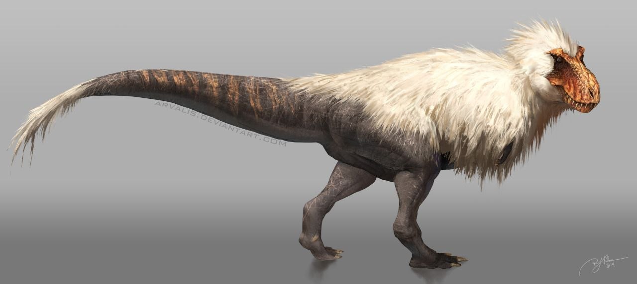 Вот вам в качестве иллюстрации забавная версия цыпленко-тиранозавра от художника по фамилии Палмер. Предупреждаю, она основана не на четких данных, а на предположении, что у тираннозавра, если и были перья, то пух как у птенца. Логика есть, конечно. Помните, я рассказывал, что если приделать цыпленку специальный вантусоподобный протез хвоста, то его походка станет как у тиранозавра?
