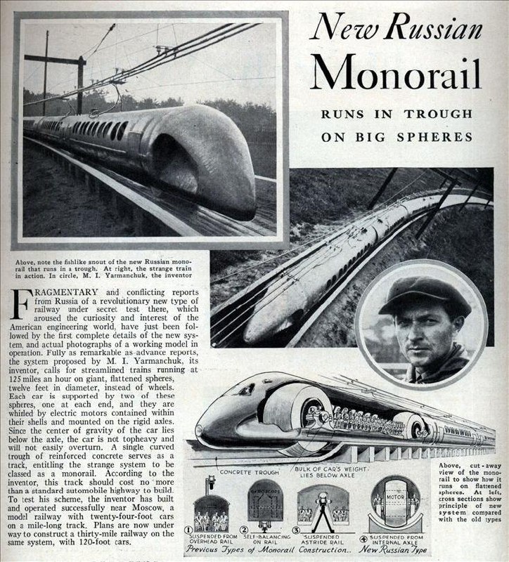 В тридцатых годах инженер-железнодорожник Николай Ярмольчук предложил, продвинул в соответствующий наркомат (так тогда в Союзе назывались министерства, если что) и даже построил действующую уменьшенную модель инновационного не то что на тот момент, но даже и на нынешний, поезда. Вместо колесных пар в нем было по шару в начале и конце вагона, а вместо двух рельсов — один желоб, который простые советские люди того времени называли лотком. Само собой как и все в Союзе назвали концепцию аббревиатурой. А вот она получилась уже и на сегодняшний лад звучной — ШЭЛТ (шаро-электро-лотковый).