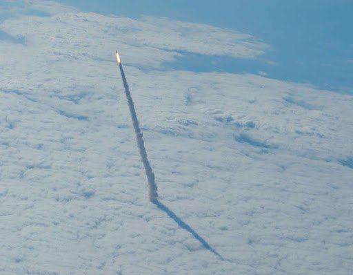 А именно твердотопливные ракетные двигатели оставляют дымный след. У этих ускорителей удалось обеспечить рекордную тягу, но в твердотопливных двигателях тягой невозможно управлять. Да и не нужно, ведь всегда есть управляемые жидкостные двигатели шаттла.