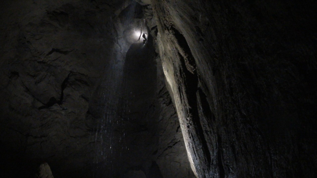 Вот вам фотка спелеолога на веревке из пещеры Веревкина.