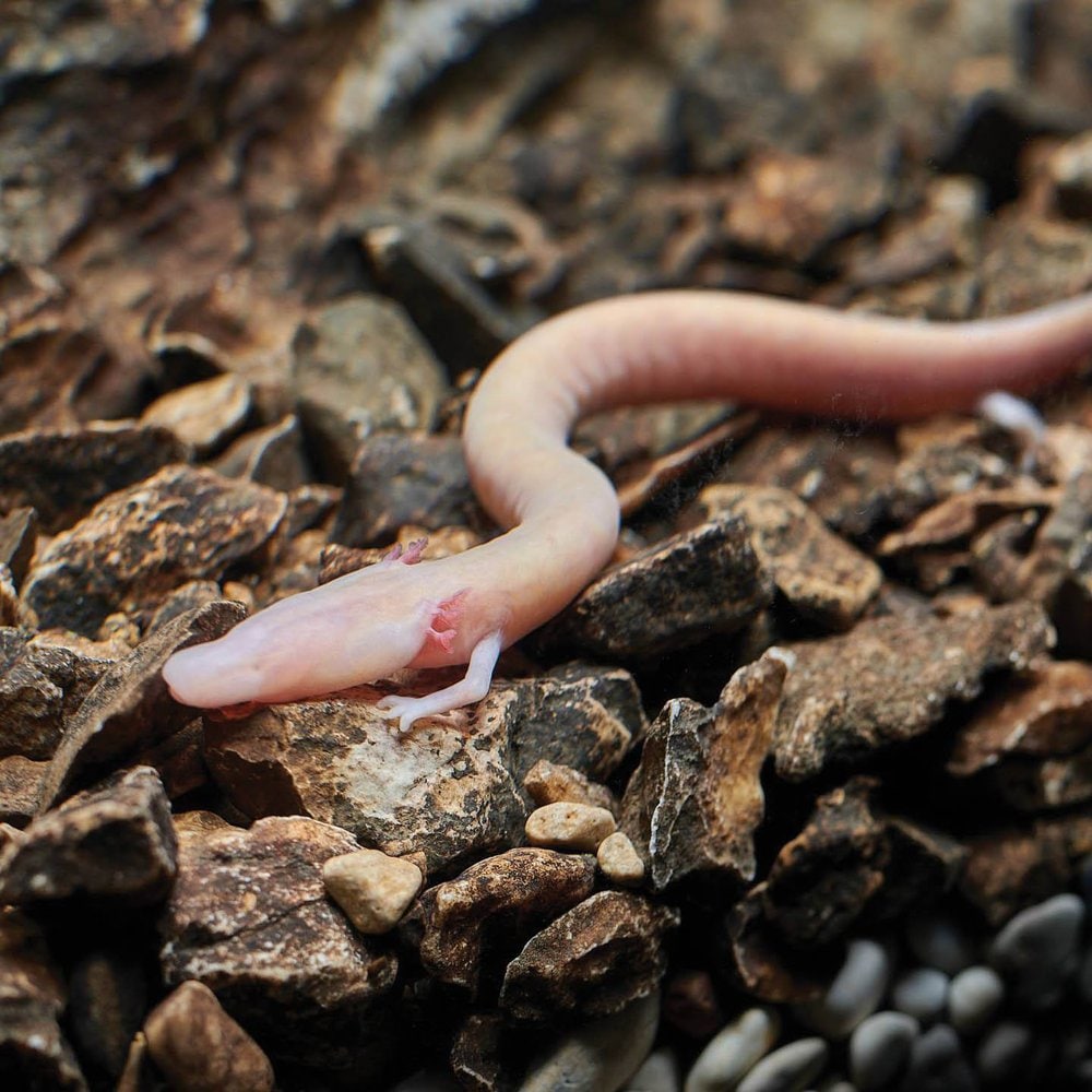 «Человеческая» — потому что розового цвета, само собой, без чешуи, потому что это и не рыба вовсе вопреки названию. До 30 сантиметров в длину. Родом из Словении, Хорватии и Боснии с Герцеговиной. Всю жизнь живут в пещерах без света при температуре около 10 градусов на глубине до 100 метров! Вот это гоблины. Слепы, но свет воспринимают всем телом. Исключительно, чтобы сныкаться, если свет появится.