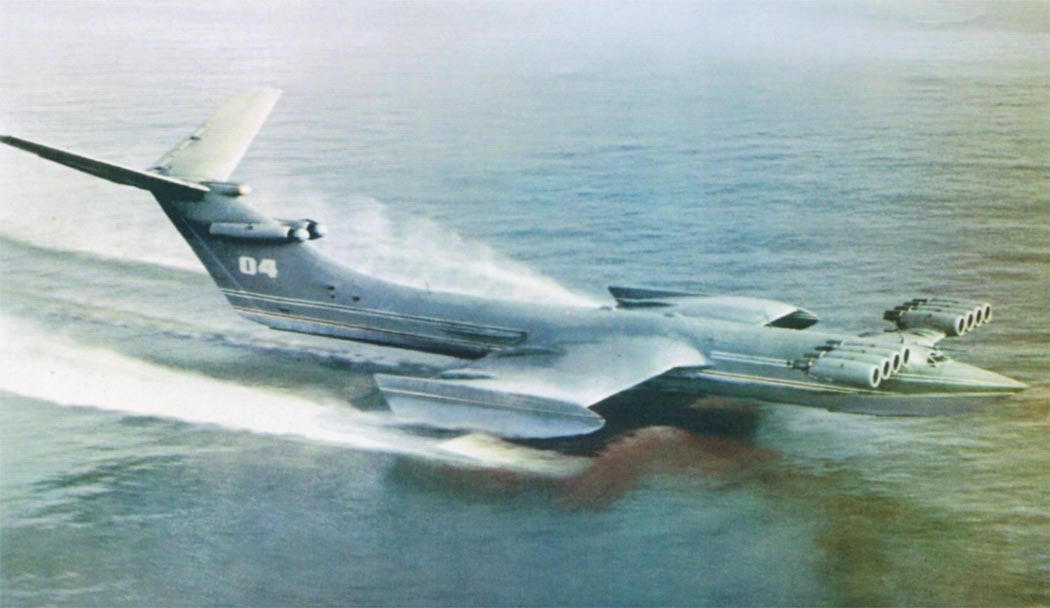 Прямиком из 70-х вам шлет привет «Каспийский монстр», прозванный так на западе. При размахе крыльев в 37,6 м, длина его была аж 92 м! И хвост в габаритах не сильно уступал самим крыльям, достигая 37 метров в размахе оперения. И еще, внимание: поднимал он 304 тонны! В два раза больше «Мрии». Столько селедки за сутки добывают сахалинские рыбаки.