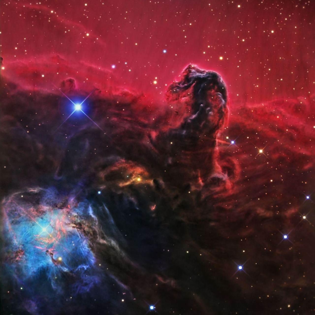 Полторы тысячи световых лет от нас. Это всего лишь участок огромного облака Ориона, диаметром более тысячи световых лет (почти все огромное созвездие Ориона). Истинный размер Головы — где-то 3.5 световых года. Угловой — примерно 8 на 6 минут. То есть будь у человеческого глаза выдержка как у фотоаппарата, а атмосфера прозрачна, мы бы и без астрофотографов разглядели бы ее как темное пятнышко в «правой ноге» Ориона.