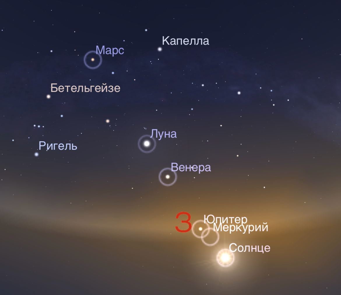 Венчает парад Луна, а выше — бледно-оранжевый Марс. Да-да, именно по этой бледной точке катаются сейчас марсоходы, летает вертолет и гуляют песчаные бури.