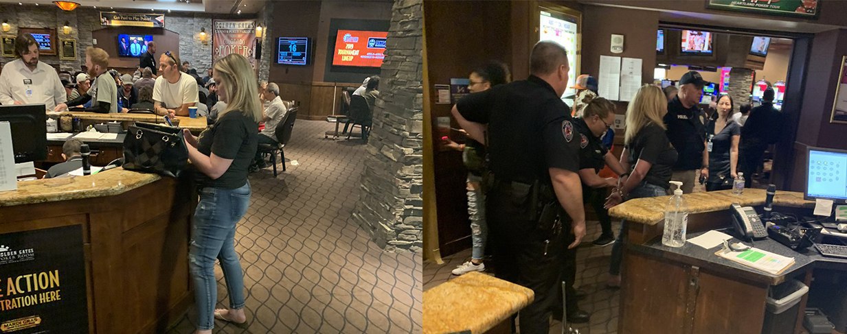 Тут бабёнка впала в тильт, вылетела с турнира и начала требовать на кассе рефанд бай-ина, а вдобавок ВЫЗВАЛА ПОЛИЦИЮ, чтобы те штрафанули обидчика.