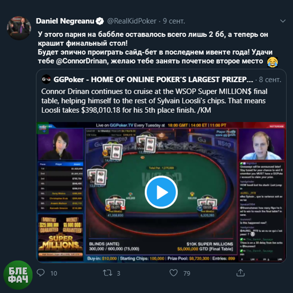 🙀 Даниель Негреану умудрился проиграть сайд-бет в размере $100.000 в последнем ивенте WSOP Online 2020 - $10K Super Millions. Дело в том, что Kid Poker принимал ставки на то, кто сможет выиграть золотой браслет WSOP, и одним из тех, кто поставил $100.000 на свою победу, стал Коннор Дриннар. Американцу удалось не только выиграть престижнейший трофей в последнем ивенте серии, а также $1,4 миллиона призовых, но и получить дополнительные $100.000 от Даниеля. Кстати, в финале Дриннар одолел игрока из Казахстана Данияра Аубакирова, который пополнил свой счет на внушительные $1 миллион.