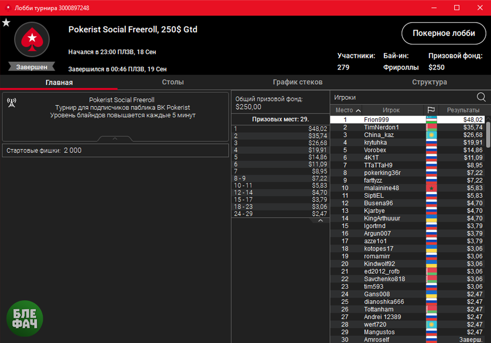 🎉 Наши поздравления всем игрокам, попавшим в ИТМ. Всего во фриролле успели зарегаться 279 игроков, на этот раз практически все участники турнира были из стран постсоветского пространства.