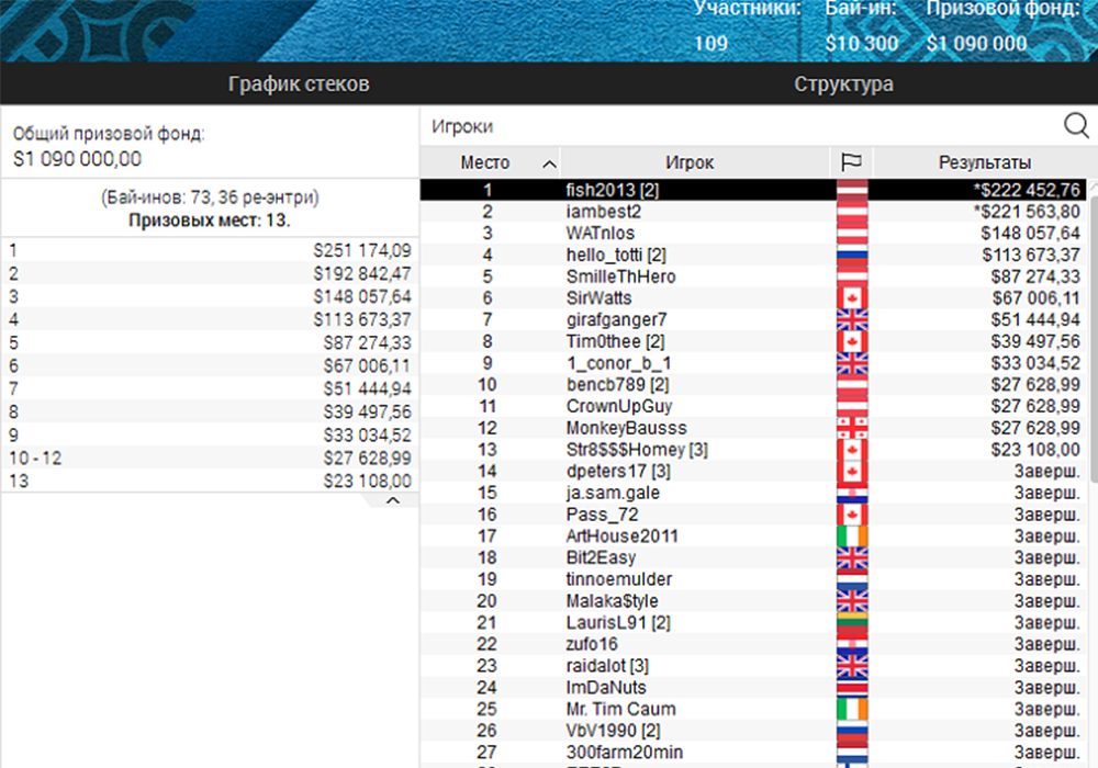 За финальный стол пробился известный российский хайроллер играющий анонимно под никнеймом "hello_totti". Россиянин вылетел на четвертом месте, заработав $114K.