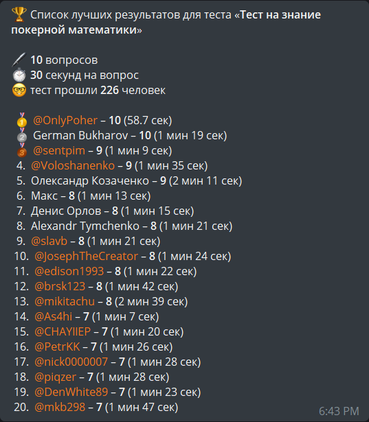 ⚡ Подводим итоги пилотной викторины - напомним, что тема первого теста была "Покерная математика".