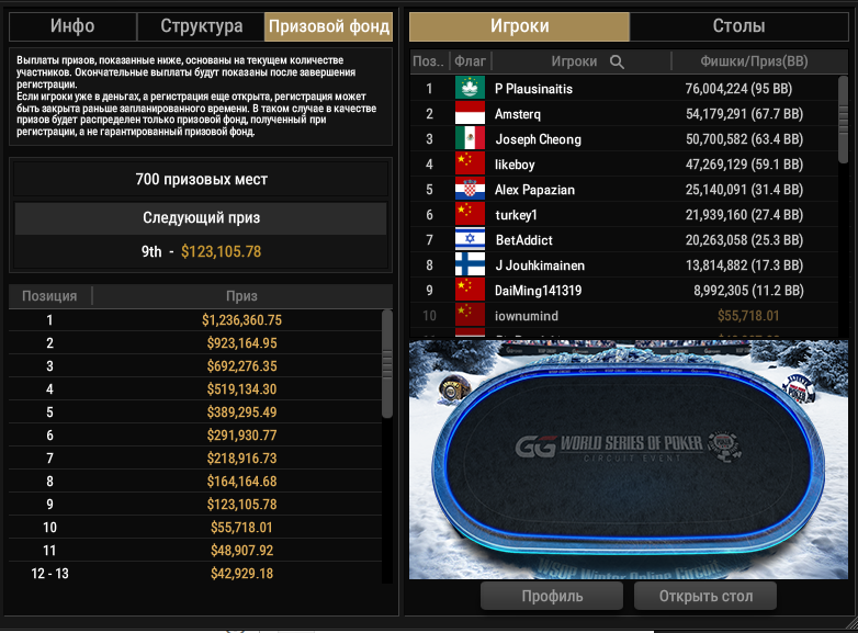 Призовые выплаты, позиции игроков и их стеки на скриншоте к посту 👇