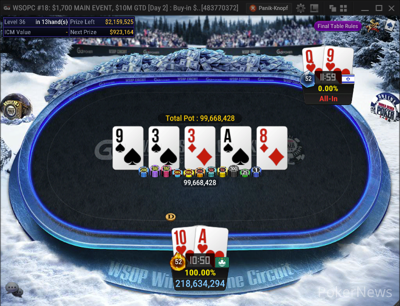 Емельянов же выполнил свою программу максимум - войти в топ-5, заняв четвертое место ($208.576). Роман вылетел в довольно обидном споте - сб против бб запушив карманные тройки и получив колл от восьмерок Паскаля Хартмана.