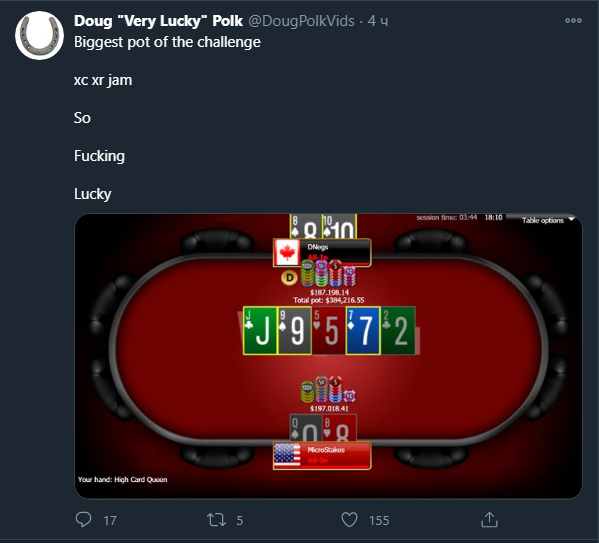 Ну а в посте после последней разгромной сессии Даг выложил самую крупную раздачу за челлендж, в которой проиграл банк в $187K и подписал: