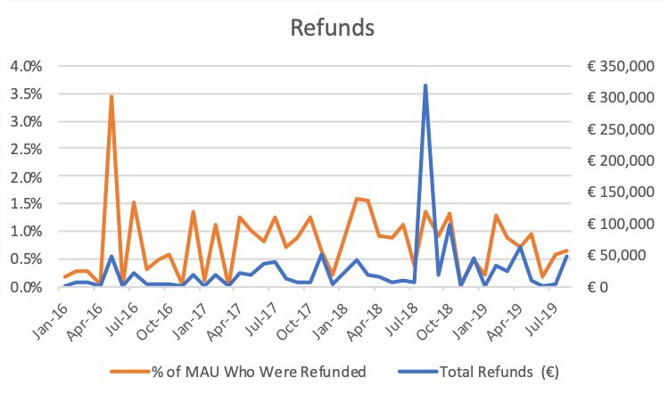 Самую крупную сумму рефандов €318,784 MPN выплатили в августе 2018 года, когда вскрыли крупный бот-ринг.