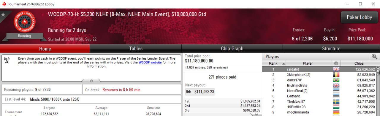 А в холдемном мейне WCOOP сегодня вечером начинается финалка. Чипаком идёт известный в сети хайроллер-фиш Талаль «raidalot» Шакерчи (хотя по уровню игры он может дать прикурить многим)