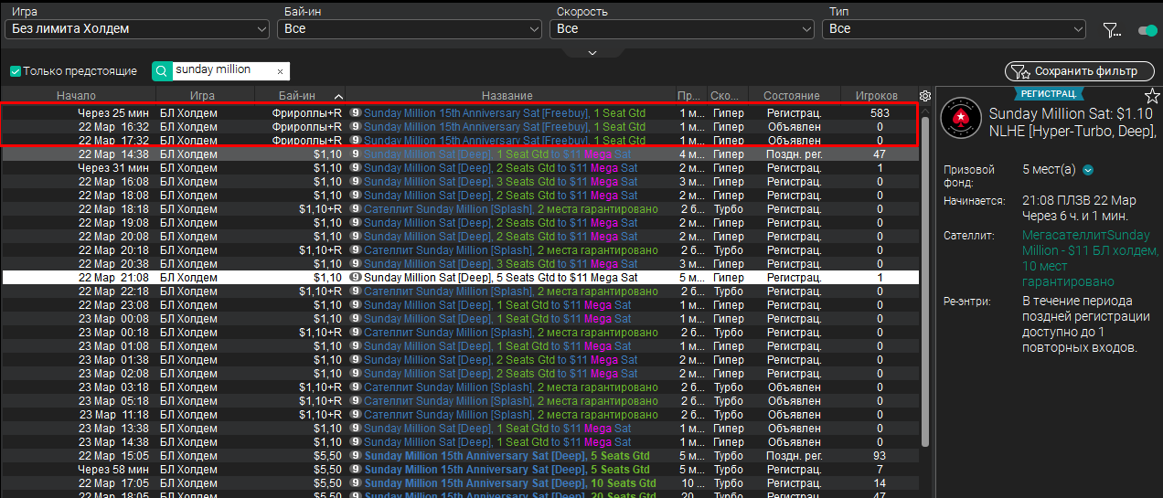 🚂 Успейте запрыгнуть в уходящий поезд - в стартовавшем 21 марта юбилейном Sunday Million 12,5M GTD поздняя регистрация закрывается через 6 часов, и в нее все еще можно зарегаться напрямую за $215. Правда, в распоряжении у вас окажется всего лишь 8 бб, но раскрутиться с них вполне реально.