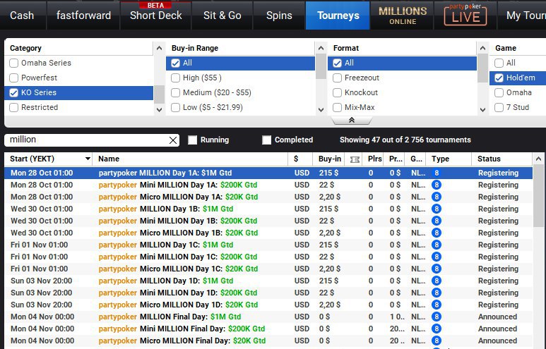 Теперь Weekly MILLION будет еженедельно проходить на partypoker в трёх категориях: $215 / $22 / $2,2 — их гарантии будут $1,000,000 / $200,000 / $20,000 соответственно.