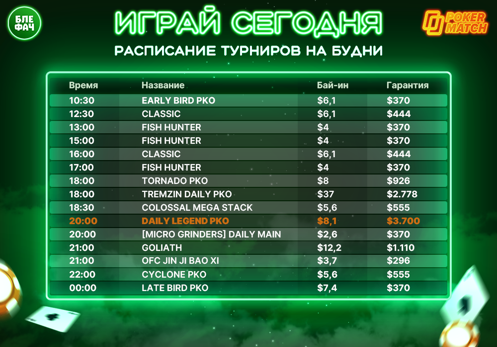 🔥 Подборка регулярных турниров на будние дни от Блефача и Покерматча!