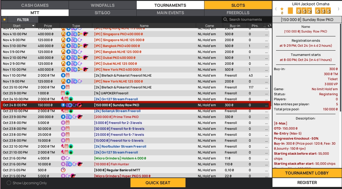 👍 Гайз, в регулярной сетке Покерматча мы бы отметили крутой воскресник Sunday Row PKO за 300 грн ($11,11) и гарантией 150.000 грн ($5.555). Удобное вечернее время, доступный бай-ин, динамичный и азартный прогрессив нокаут формат делают этот турнир обязательной к воскресной загрузке.