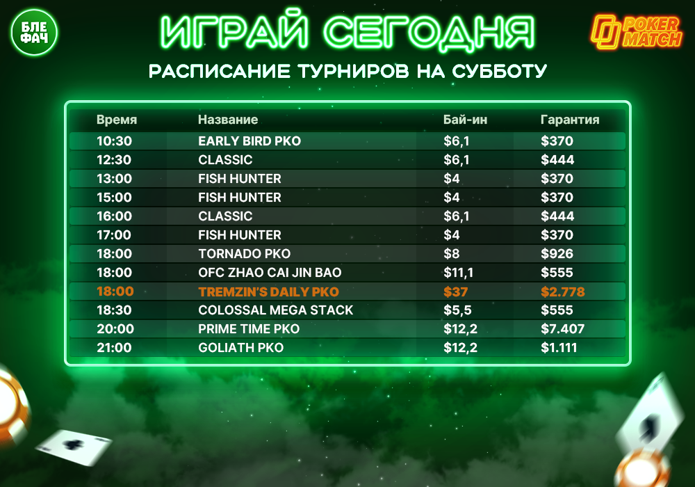 🤩 Субботняя подборка турниров на Покерматч. Время по Москве.