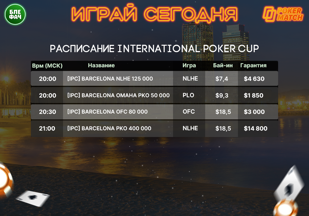 🔥 Приглашаем всех игроков в Барселону (и даже фанатов Реала 😂) - ведь именно в этом прекрасном городе сегодня состоятся 4 крутых турнира серии IPC на PokerMatch. Расписание сегодняшних турниров прикреплено к посту.