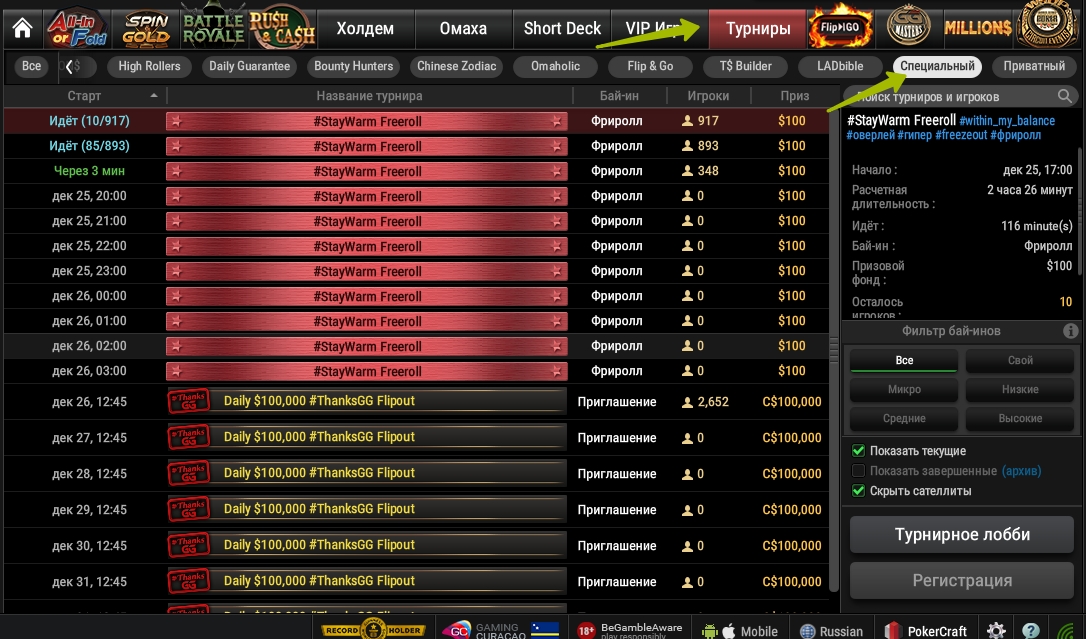 • Найти фрироллы можно во вкладке Турниры —> Специальный