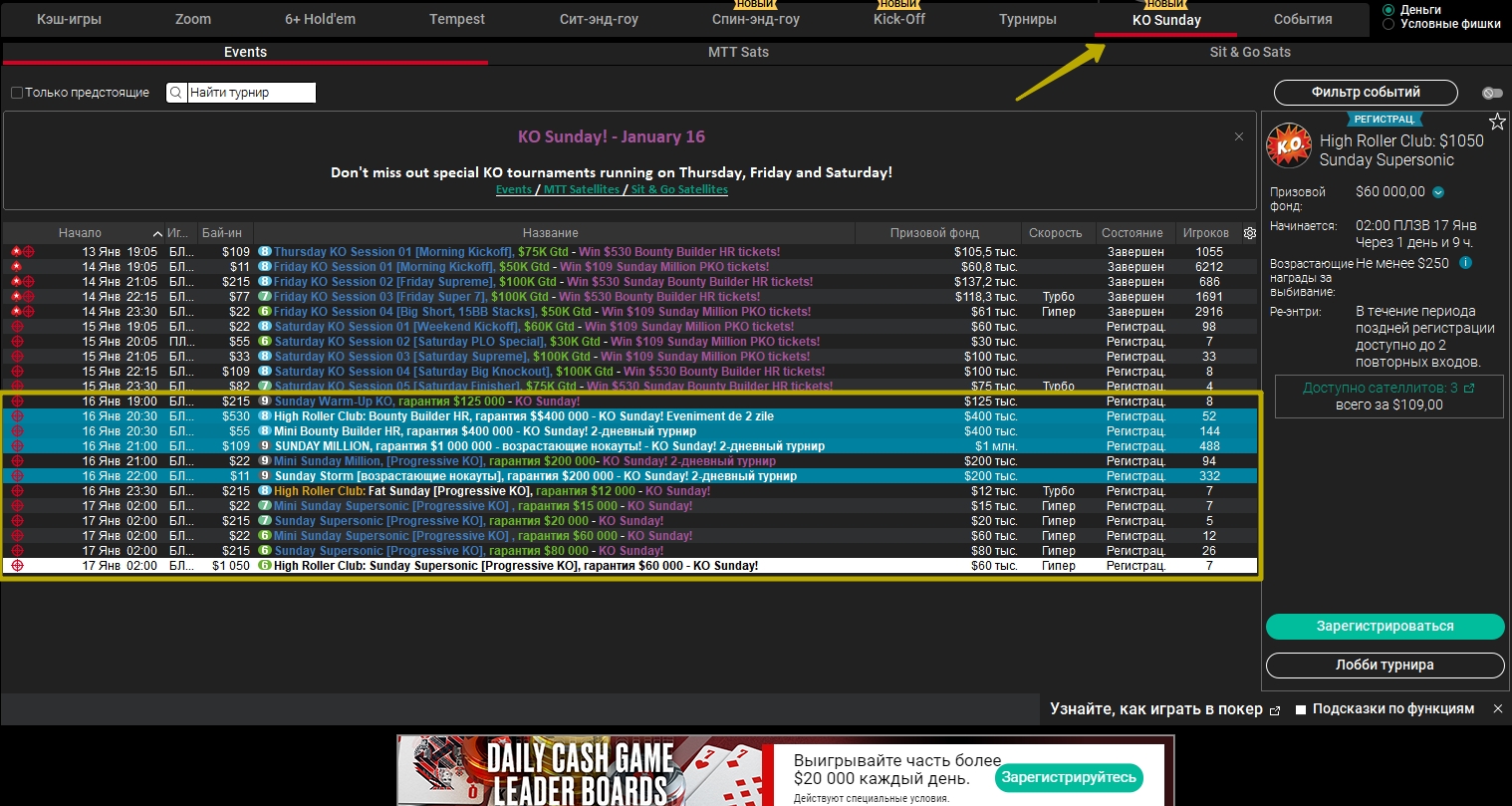 Всего таких турниров в лобби будет 12, с бай-инами от $11 до $1050. Расписание воскресных турниров прикреплено к посту, а сами турниры находятся в специальной вкладке "KO Sunday" в турнирном лобби PokerStars.