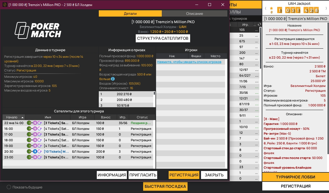 🛰️ Бай-ин на сегодняшний миллионник составляет 2.500 гривен, но отобраться в него можно через сетку многочисленных сателлитов, бай-ин в которые стартует всего лишь со 100 гривен. На момент написания доступны целых 7 сателлитов в ивент, так что, вполне можно отобраться в турнир мечты и побороться за миллион с сильнейшими игроками.