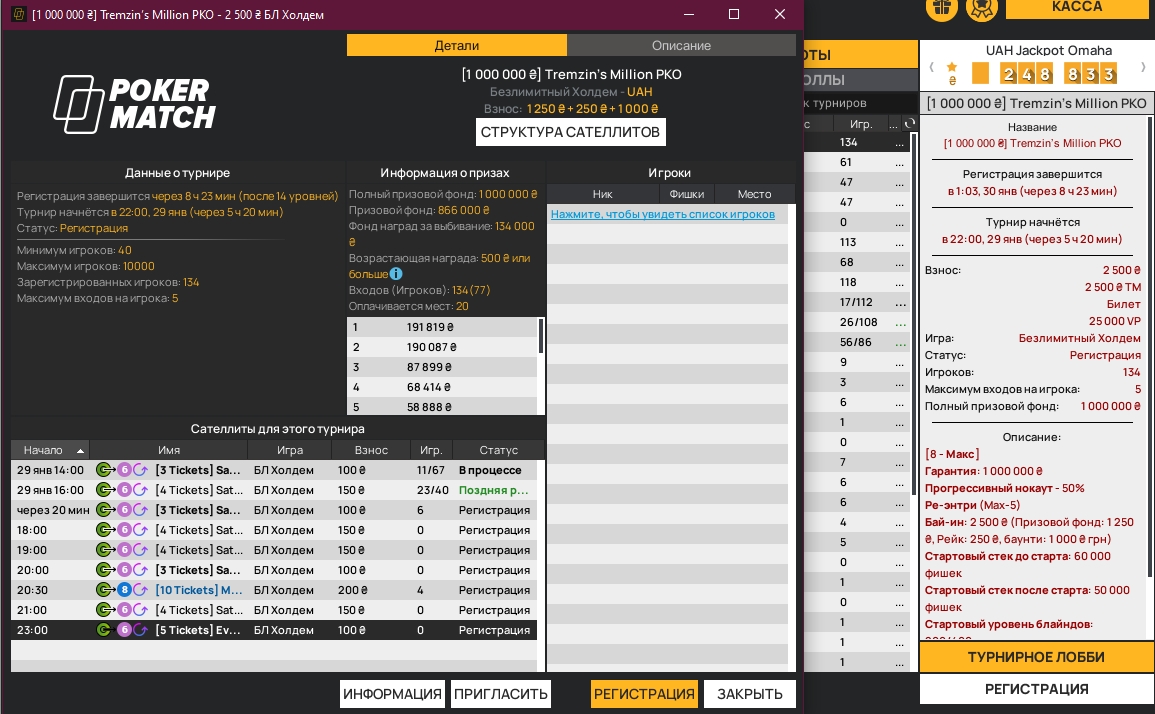 - Tremzin’s Million PKO на PokerMatch с гарантией 1,000,000 гривен.