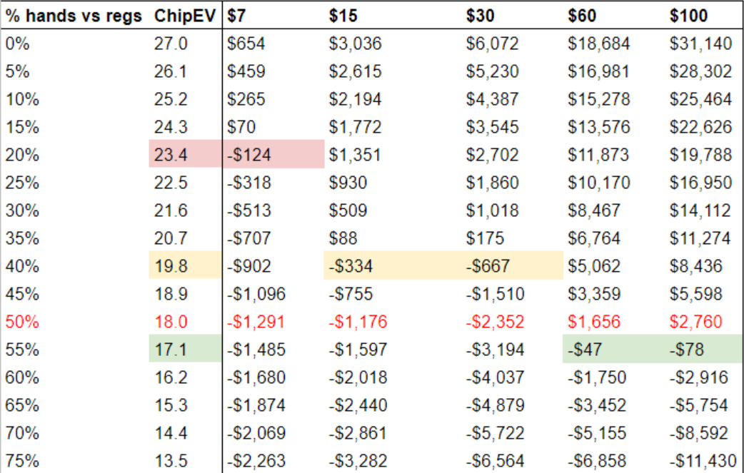 Кратко говоря, на лимитах $7-30 включительно, если вы в турнире играете хотя бы 40% рук против рега своего уровня, то оба гарантированно математически проигрываете фишки. Выигрывает только PokerStars.