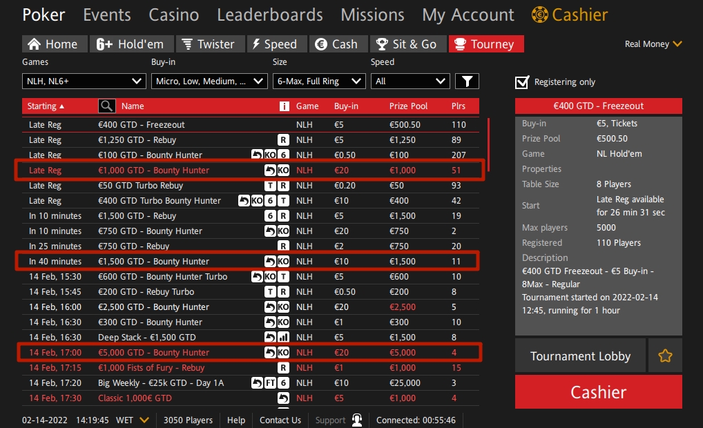 ☝ Зачётные турниры Bounty Hunter проходят в руме регулярно, а бай-ины в них варьируются от €0.5 до €100. По итогам каждого зачётного дня топ-50 лучших нокаутёров получают турнирные билеты номиналом от €1 до €100.