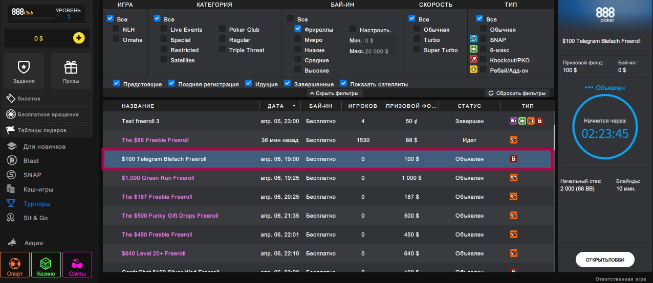 🔥 Чтобы узнать пароль на турнир $100 Telegram Blefach Freeroll с гарантией $100 на 888poker, кликните на кнопку "Пароль" под постом.