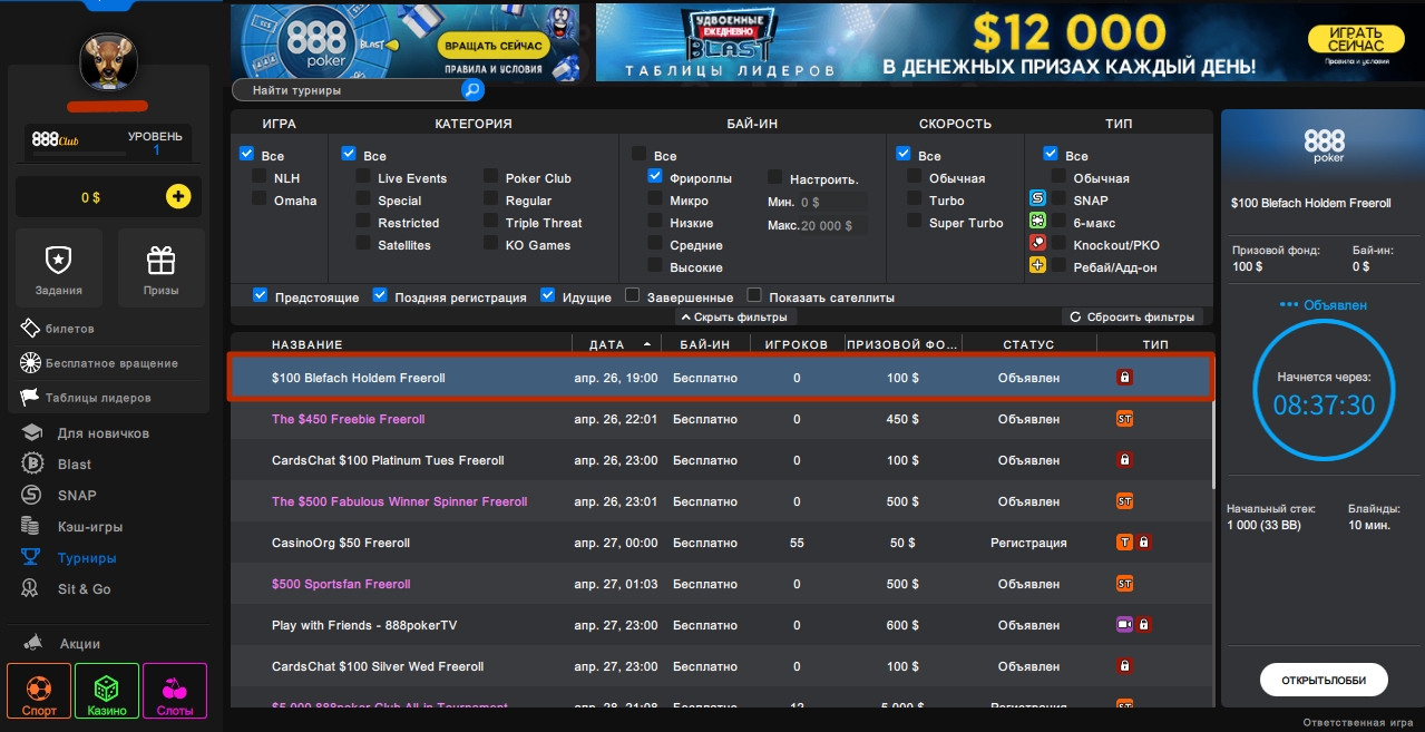 🗝️ Чтобы узнать пароль на турнир $100 Blefach Holdem Freeroll с гарантией $100 на 888poker, кликните на кнопку "Пароль" под постом.