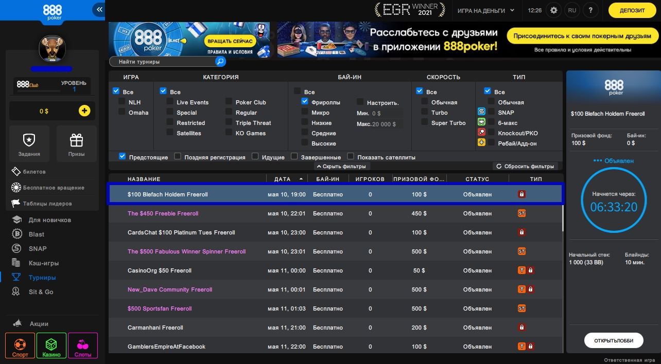 🗝️ Чтобы узнать пароль на турнир $100 Blefach Holdem Freeroll с гарантией $100 на 888poker, кликните на кнопку "Пароль" под постом.