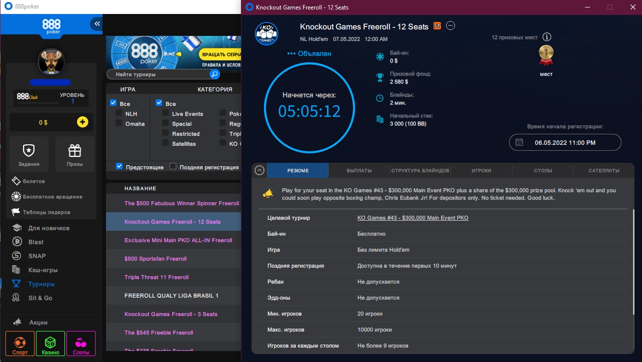 🔥 Сегодня, 10 мая в 18:00 МСК на 888poker стартует бесплатный турнир с призовым фондом $100. Вкратце пройдёмся по ключевой инфе: