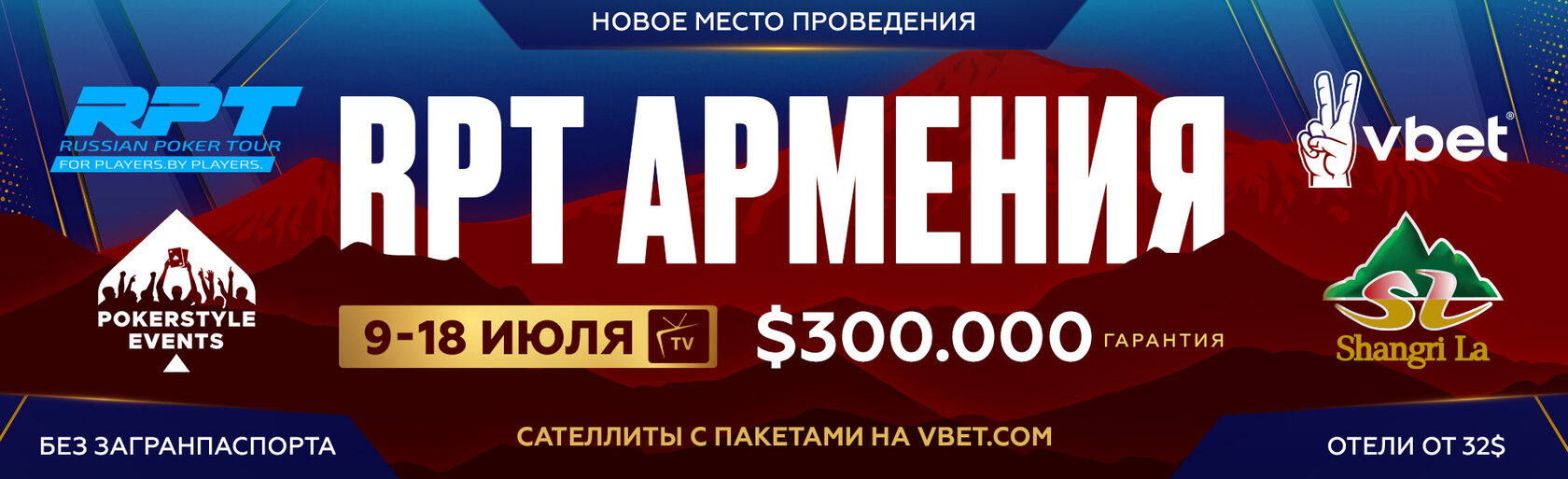 👋 Отличные новости для любителей поиграть вживую: RPT анонсировали новый этап серии, который будет проходить при поддержке Vbet с 9-го по 18-е июля в известном казино Shangri-La в Цахкадзоре, Армения.