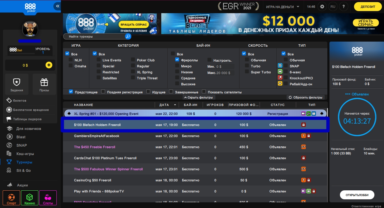 🔥 Сегодня, 17 мая в 18:00 МСК на 888poker стартует бесплатный турнир с призовым фондом $100. Вкратце пройдёмся по ключевой инфе: